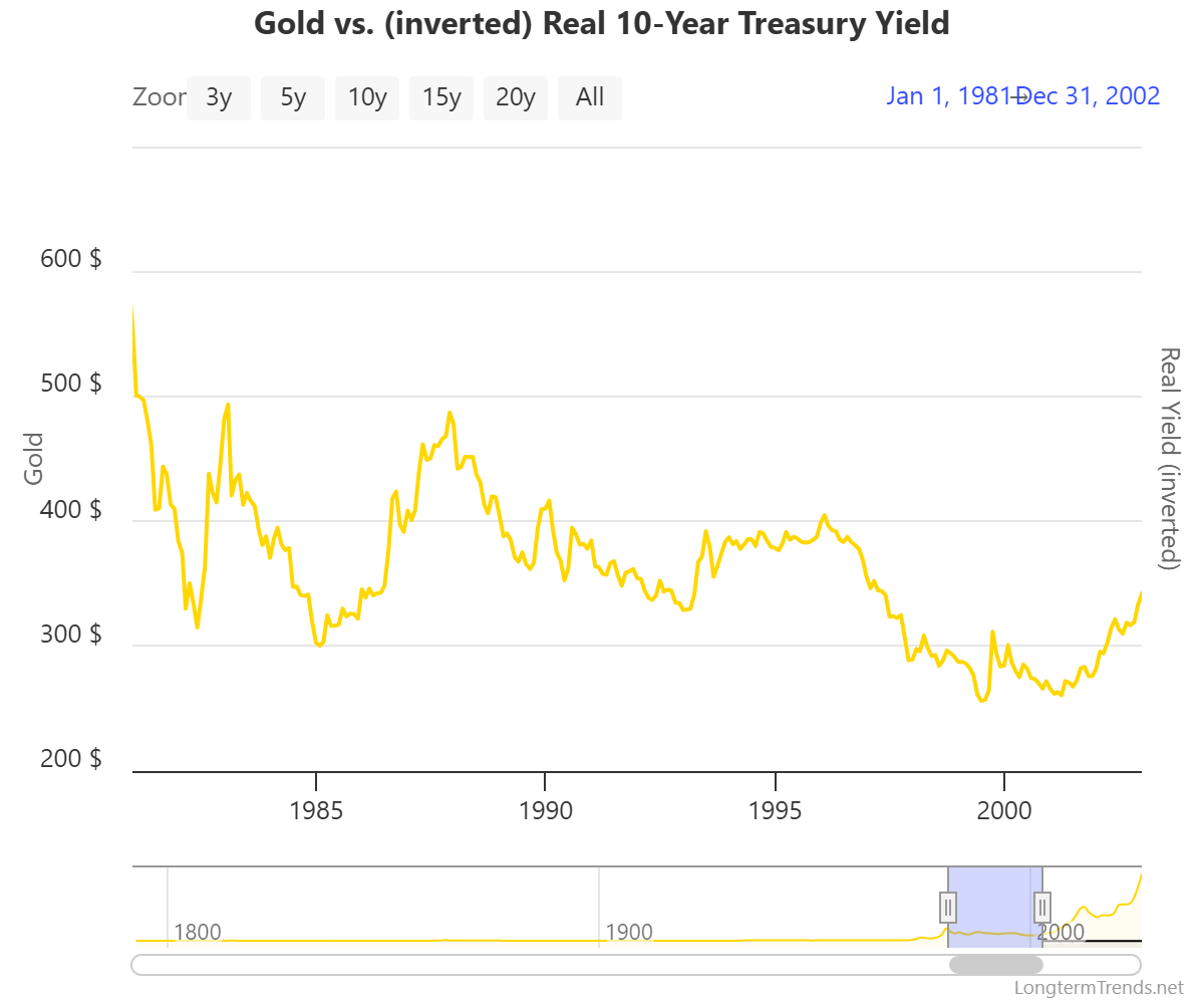 - Giai đoạn 1981-2002: Lợi suất thực của Mỹ gần như luôn ở mức dương. Đây là giai đoạn thị trường “gấu” của vàng, khi giá giảm từ đỉnh cao 800 USD xuống mức đáy khoảng 250 USD.